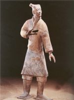 立射俑为一号车马坑内弩兵。头上免盔束发,发髻偏于头的右上方,身船交领右袵短褐,腿扎行縢,足蹬薄底方口浅幫齐头履,并紧系鞋带。头左转前视,左肩斜向下,手直掌,右手半举于胸,左腿曲向前,右腿直向后蹬,似拉弓搭箭。