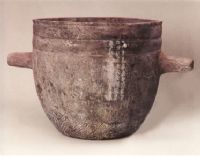陶量平口,方唇,简腹,平底,泥质灰陶,腹上部两侧有一对称的鋬耳,腹部至底施绳纹。