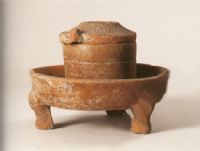陶磨由上下磨组合而成,上磨盘一侧有供插推槓的槽沟,整个磨盘置於三足式圆盘之中。