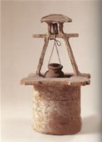 明器模型,泥质红陶,外施白粉。井筒浑圆,上阴刻弦纹两道。井坦平面呈[井]字形。