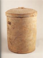 器身圆筒状,子口合盖,盖有双片钮,盖面饰篦纹和弦纹四道。矮圈足,圈足有对称的双孔,以穿绳带。腹部有弦纹一道,两侧有耳,筒内壁朱书隶体[九真府]三字。[九真]迺汉代郡名,可见此器物与九真郡有密切的联系,对准確判明墓主人的身份有着重要的参考价值。