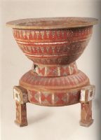 上甑下鬲合成甗,可以同时蒸、煮食物。甑:盆形,扳沿、平底,圈足,底上佈密集的圆形气孔;鬲:敛口,溜肩,扁鼓腹,圜底附三柱足。该甗与同墓出土的陶鼎、陶壶配伍成套,呈现出中原地区承继先秦葬礼的遗风。