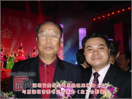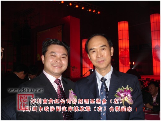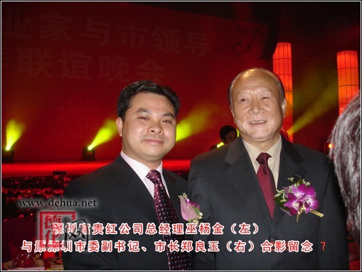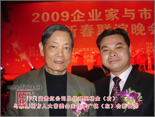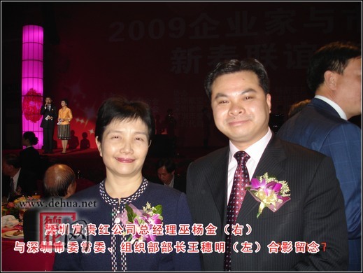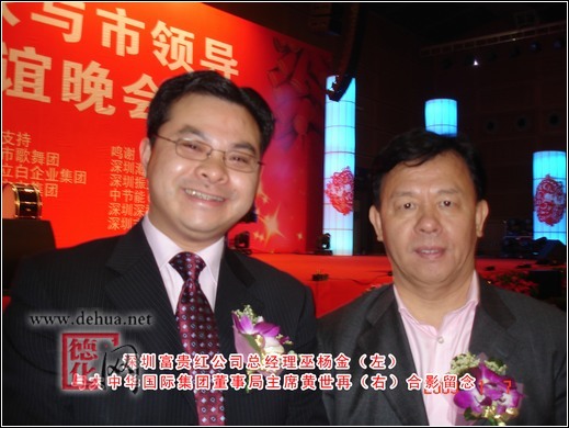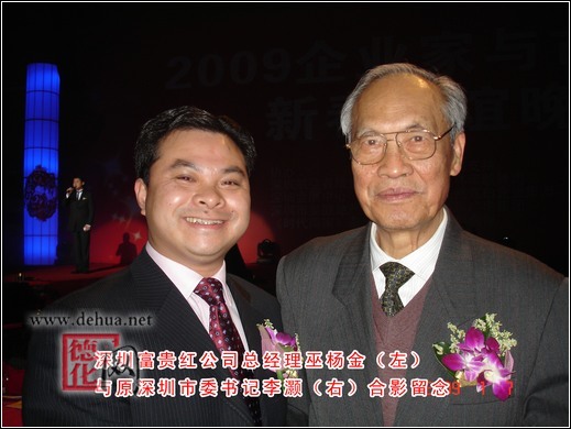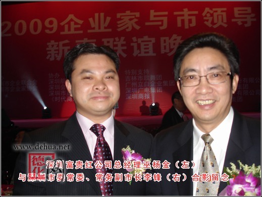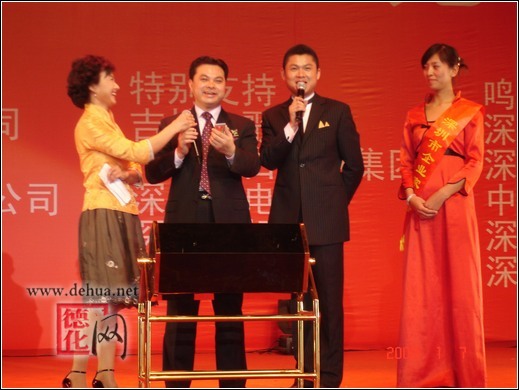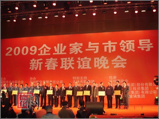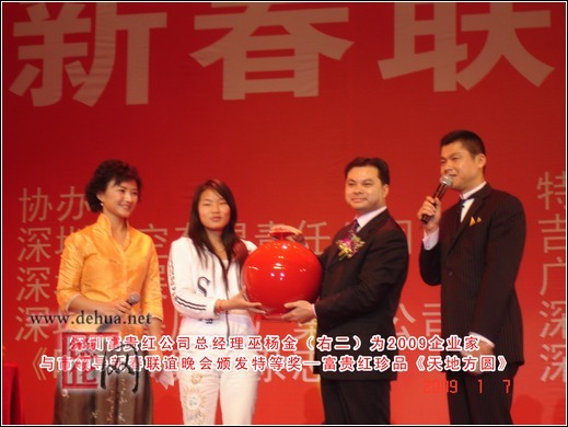 公司总经理巫杨金(右二)为2009企业家与市领导新春联谊晚会颁发特等奖—富贵红珍品《天地方圆》