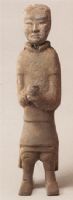 俑头戴盔,上身穿交领窄袖短襦,下着战袍,外罩甲衣,并在战袍下两腿外侧垂有三角裾,脚蹬战靴,双臂曲肘,双手作把握状置於腰前部,双拳中有孔贯通(原为手持兵械)。