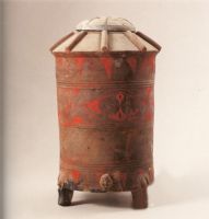 陶囷为圆桶状,圆形顶盖上有脊和瓦垄,盖中有圆孔。底有兽首形三足,在底部周围还存有一贴塑的人首装饰。