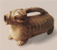 口部饰有虎首,躯体作圆筒状,背有扁平提梁。四肢向前屈曲作卧伏状。腹部和四肢刻划条纹来表现虎斑。釉为酱黄色,剥落严重,剥落处露红胎,胎质疏鬆。此器形态生动有趣,造型朴拙。陶瓷虎子在我国使用范围很文,年代久远,式样颇多,此迺最早的一种。