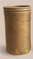 杯呈圆筒状,直口圆唇,平底。近口沿处饰上下两道内凹纹,其下,两道弦纹中隐刻一周水波,共同组成一圈纹饰带。