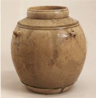 罐近似筒形,直口,圆唇,弧肩凸起,鼓腹,底部内凹,肩部饰刻划的锯齿纹一周,腹部镟削三道间隔的阴弦纹,腹壁有麻布印纹,肩腹之间置有四个等距离横系,器内口和外壁均施釉。