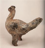 灰陶雄鸡神态安详,昂首,红冠,翘尾,伸颈前望,两翅刻有羽毛纹,翅前端两边各一红点,全身加彩粉。