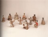 彩绘乐舞俑是在一个圆形彩绘陶盘上,塑造了二十五个人物,形态各异,栩栩如生。其中坐俑十二儿歌,站俑八个,骑俑二个,残碎三个。均为泥质灰陶,红彩勾勒衣服。