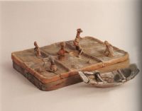 水田分为六方,五方田面刻水波纹,一方田面为篦点纹,每方有一俑在劳动。第一方俑戴斗笠,双手作扶犁状,犁头略呈心脏形;第二方俑执镰作收割状;第三方一俑坐田埂上作磨镰状,田裹有两禾堆;第四方一俑作扶犁状,田面有一犁头,旁有两圆堆;第五方一俑作俑企立,田面篦点纹表示插过的秧苗;第六方附两禾堆,有一俑似在綑稻草。