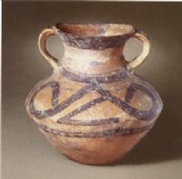 敞口、长颈中凹,折肩、扁腹、平底。颈部有两个对称的双耳,口与肩部分别饰黑彩宽带纹与羊角形纹。双耳罐是辛店文化典型的陶器之一。