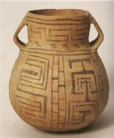 直口、长颈,深腹下部圆鼓、平底。颈部有对称双耳。通体用黑彩绘出较为规整的弦纹与单双线云雷纹。造型匀称,装饰华丽
