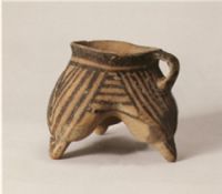 敞口、短颈,斜向内收,三个肥袋足,高尖足,口与袋足间有单耳,器表用黑彩在口沿处饰带条纹,袋足表面饰并列黑条纹,裆部饰横并列黑条纹。造型别致,装饰华丽,系辛店文化姬家川类型中具有代表性的陶器。
