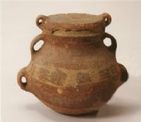 小口、短颈、圆溜肩、扁圆腹,平底。肩部与腹部各有对称双耳。平顶盖,中间有一小圆孔,盖两侧也有对称双耳。器表用黑褐色彩,在上腹部绘椭圆形三点纹带条一周。其颈部、肩部、下腹部与盖表全塗黑褐彩宽带条。纹样简单而朴实。