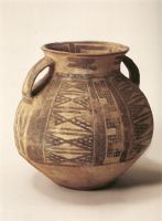 小口外侈、低领、溜肩、下腹圆鼓、平底。肩部有两个对称的耳,口内外、耳面和腹上部,全部都黑彩纹饰。其中腹部的宽竖条纹间,分别绘对三角网纹曲折纹。