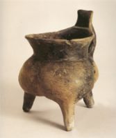 敞口、长颈内收,圆肩,深腹圆鼓,三袋状足。并在口的一侧有一上仰的槽状流。造型别致,具有明显地方特征。