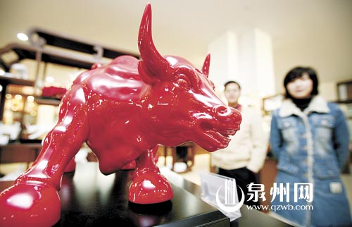 牛年将至,身披辣椒红、寓意牛年开拓辉煌的牛形瓷器颇受市场欢迎。昨日,德化一家陶瓷企业的展厅内,前来订购瓷器的客户在一头“猛牛”前驻足观赏。(陈起拓 张九强摄)