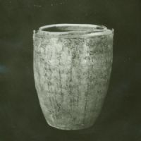 束口、无颈、折肩、直筒形腹,平底,器面修整不平、内外施釉不匀。下沿至上腹对称二绳索。上腹拍印重线水波纹和云雷纹。