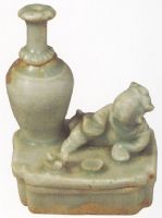 此件砚滴分上、下兩層,底座為長方形,四角呈棱花口,浅腹,平底。上部分舆底座有子母口相吻合,並堆塑仰坐神童。身旁塑一花瓶,瓶內中空,可盛水,瓶上作一圆柱形蓋钮,中间有一小洞,瓷鈕可插入瓶中吸水,滴入砚石上研墨。此器不僅實用,又是書房精美的陳設品。