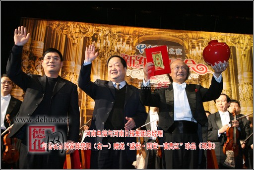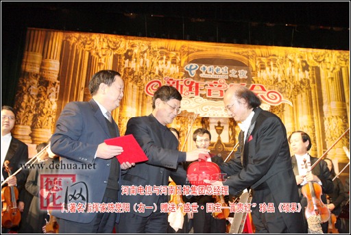 年近古稀的指挥家陈燮阳激情四溢,手中的指挥棒着了魔似的灵动有力。音乐会一开场就奏起欢快喜庆的旋律,歌剧《鲁斯兰与柳德米拉》充满明朗的色调很快把听众带进交响乐的迷人世界。轻快的《乘风破浪圆舞曲》、柴可夫斯基的《波罗涅兹舞曲》、热闹的《波斯的集市》、欢乐的《假日的小号手》,流畅优美的旋律随着他的指挥棒,从管弦乐队的乐器中如水般流泻出来。芭蕾舞剧《红色娘子军》选段熟悉的旋律一出,听众顿感精神振奋,那些青春的回响,那些难忘的记忆,令人心潮澎湃。还有民族管弦乐《茉莉花》、方可杰的《大起板》、京胡交响乐《普天乐》,一曲曲听来都是那么亲切,那么有韵味儿。不少观众感慨:今年的音乐会增加了民族音乐的成分,听起来特别得劲儿。演出结束后,河南日报报业集团和河南省电信公司领导把一个大红色的“富贵红”瓷瓶赠送给陈燮阳。瓷瓶由河南富贵红贸易有限公司(福建德化)友情提供,象征吉祥平安。
