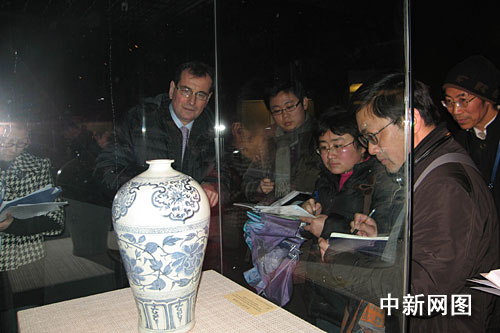 图为台北鸿禧美术馆馆长詹姆斯·史彬士介绍元代青花牡丹纹梅瓶