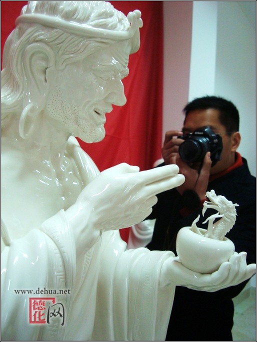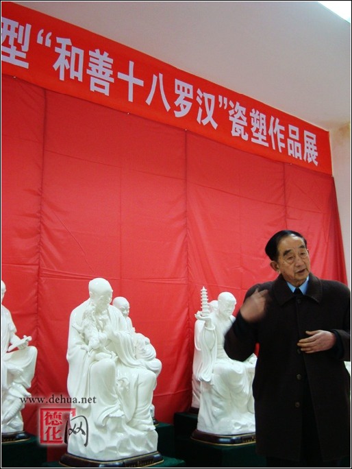 此次展出的“和善十八罗汉”作品选用被誉为“中国白”纯净上乘瓷土为原料,其配方经无数次研究实验,克服了大体积的中国白瓷在高温炼制过程中易开裂软塌变形等困难,精心设计、设计、精雕细刻并经1300度以上高温煅烧而成。作品高约1米左右,重100多斤,体量较大,造型各异,质地洁白无瑕,晶莹剔透,玻化程度高,瓷质坚实不吸水不变质,这是德化县瓷坛史上的又项突破,打破以往外界认为“德化陶瓷无大器”的看法。