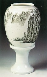 杨先生的瓷刻作品传世之作稀少,如今仅能从上海工艺美术研究所藏品中见到。其中瓷刻山水作品的意义在于刻出极强的中国画画意和笔法(如图)。观看整个瓷刻作品,似乎是在观赏一幅传统的中国山水画:皴、擦、染、点,都有细腻的表现;笔墨设色浓淡相宜,渲染有致,所有的刻画都显现出中国画特有的笔法,似乎都没有了刀痕的踪迹,令人叹为观止。