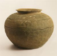 小口外侈,低领,圆肩。深腹圆鼓、平底。颈部饰弦纹,肩与腹拍印密集的小方格纹。呈灰色。造型庄重深厚,装饰华丽。系实用的印纹硬陶甕。