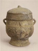 直口内弇,深腹下部略鼓,高圈足。上腹部有两个对称竖系鼻。口上盖有圆鼓顶带小握手器盖。腹部饰弦纹带条。系仿同期青铜卣形制而作。