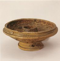 大口,沿内折、浅盘,壁斜直、圜底,喇叭形座。别致的是在盘内底部中间带粘结有一个直口、直壁杯形器。盘内周壁、杯外壁、外沿面上均饰密集而排列有序有弦纹。器表施青色薄釉。造型奇特,装饰精美,是一件罕见的原始瓷器珍品。