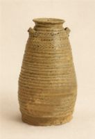小口外侈,短颈,腹部上细下粗略鼓,平底。近颈部两侧有对称双系耳。通体满饰密集弦纹。