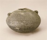 小口、低领、圆溜肩、扁圆腹、平底。肩部有两个对称的双系耳。器表塗黑色陶衣,并拍印有密集的小圆圈纹组成的数周带条。装饰美观而华丽。