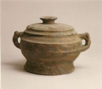 敛口、折肩,扁圆腹、圈足。颈部两侧有两个对称的兽头形耳。口上覆盖有敞口、圆折棱鼓面盖,盖顶中有一圆形握手。器表塗橘黄色彩衣,并在肩部与盖顶绘有红色云雷纹。