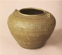 敛口、低领、圆肩,深腹微鼓,平底。肩部有两个对称的套环系耳。肩部饰由竖线纹、锥刺纹与弦纹组成的图案带条,上腹部饰竖线纹带条,下腹部饰弦纹与划纹,器表施青黄色釉。造型朴实庄重,釉百晶亮。