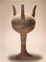 泥质灰陶。由两个半球形器组合。上部为盖,盖作倒鼎形,三足朝上,足间以弦纹相隔。下部为浅盘,高柄,凹底,足沿成喇叭形。器柄至足部有三组共计十四道弦纹,器身饰有朱绘。其造型具有战国时期的典型特征。