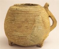 泥质灰褐硬陶。小敛口,低领,深腹圆鼓,平底,三矮足。腹侧有一弓形鋬。通体饰密集的弦纹,并有晶莹的自然釉。下腹部近鋬处刻有符号。