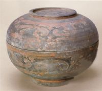 泥质灰黑陶。两个敞口、浅圆腹、矮圈足与碗形器相扣合。在器表的灰黑色地上,用红、白色彩绘出卷云纹与带条纹图案装饰。有仿同期彩绘漆木器形制与纹饰的特征.