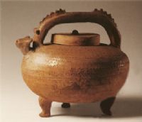 小领口,口上盖有平顶直壁带钮盖,圆肩、扁圆腹、圜底,三个蹄形足。肩部前有龙首形流,前后肩间有拱形龙体提樑,提樑上部有两段锯齿纹脊棱。腹部饰数行锥刺纹,通体塗有一层豆褐色薄釉。形似青铜提樑壶。