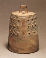随葬明器,仿青铜钟形制,符合青铜钟工艺的制作规格。器表施有一层晶亮的黄色薄釉。制作精巧,仿造逼真,显得庄重瑰丽。