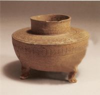 原始青瓷。小口、直领、折肩、浅腹略鼓、圜底、三个兽蹄形足,肩部饰有三周弦纹与斜线纹带条,上腹部饰波浪纹带条。通体施青绿色薄釉。造型别致,器表装饰华丽,釉面晶亮,是一件具有很高工艺价值的原始瓷器。