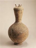 泥质灰陶。口微外侈,细长颈内收,深腹圆鼓,圈足,口上覆盖有三个兽头形钮器盖。在颈部与腹部又用红、白彩绘出各种花纹,并在腹部绘出两个对称的铺首衔环与羽毛状装饰。