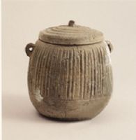 细泥质灰陶。敛口、低领、圆筒形腹略鼓,平底。近口部有两个对称双系耳,口部覆盖有直沿圆鼓顶带握手器盖。盖面饰数周凸棱形旋纹、腹部饰同竖线组成的瓦楞纹宽带条。制作精巧,装饰美观。