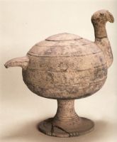 泥质灰陶。小口、扁圆腹、圜底、细柄、喇叭形座,口部覆盖圆鼓面盖,豆盘一边塑造一个昂首鸟头,相对一边又塑造一个鸟尾,整体颇像一只羽丰满的大鸟静卧在豆柄上,造型别致,形象生动。