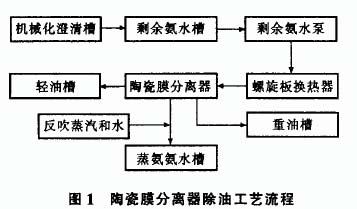 从机械化澄清槽来的氨水先流入剩余氨水槽,经泵送到螺旋板换热器换热后再到陶瓷膜分离器过滤除油, 剩余氨水送到蒸氨氨水槽, 轻油从分离器顶部排出, 重油从底部排出。在剩余氨水出口用蒸汽和水反冲洗, 工艺流程见图 1。