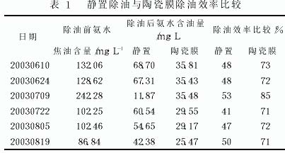 (2) 静置除油与陶瓷膜除油的比较。静置除油就是把剩余氨水放在大容积的贮槽内, 油滴靠重力作用下沉。静置除油法只能除去直径较大的油滴,除油效率在 50%以下。陶瓷膜除油在最初过滤阶段, 依靠庞大的微孔和强大的表面能, 将固液两相中的固相颗粒截留或吸附在表面上。当过滤一段时间后, 在陶瓷膜的外面形成了滤饼, 滤饼就成了过滤的主要介质。表1是静置除油与陶瓷膜除油效率的比较, 采取陶瓷膜除油后, 效率由 40%左右提高到 70%以上。