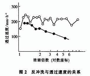 (1) 砂石过滤器与陶瓷膜过滤器的比较。砂石过滤器容易堵塞, 不能再生, 使用时间短,1年就需更换内部滤砂。陶瓷膜分离器使用一段时间后也会堵塞, 用热水反冲洗是一种非常有效的再生方法。当陶瓷膜分离器阻力超过 1kPA 时, 打开蒸汽和水反冲洗 15Min, 就能够恢复内部填料的通透性, 使过滤性能恢复到原来的水平。图 2 是反冲洗与透过速度的关系, 用热水反冲洗不仅能除去覆盖在填料表面的滤饼油渣, 还能除去膜孔中的细小颗粒, 使透过速度恢复到原有水平。