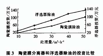 (3) 焦油浮选器和陶瓷膜除油的比较。我厂为了彻底解决剩余氨水的带油问题, 曾用焦油浮选器代替砂石过滤器处理剩余氨水, 取得了较好效果。但是用焦油浮选器除油投资太高, 图 3 是焦油浮选器和陶瓷膜分离器除油的投资比较, 除油量每增加10M3/h, 焦油浮选器投资要比陶瓷膜分离器的投资高 10 万元以上。