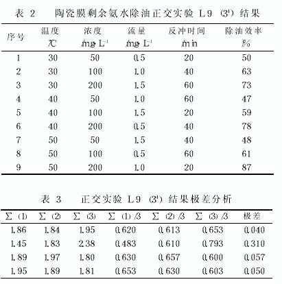 为了获得最佳操作条件, 我们在预备实验的基础上, 结合本实验的具体情况, 选 L9 (34) 正交表来安排实验。其中影响因素主要有 4 个: 温度、浓度、流量和反冲洗时间。其中温度靠螺旋板换热器控制, 浓度靠进口加水量来控制, 流量靠转子流量计来控制, 实验结果见表 2, 极差分析见表 3。