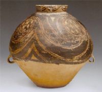 敞口、短颈、鼓腹,腰部有两系,以黑红彩绘出旋涡纹饰。